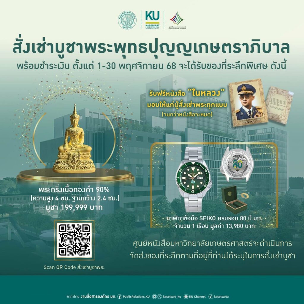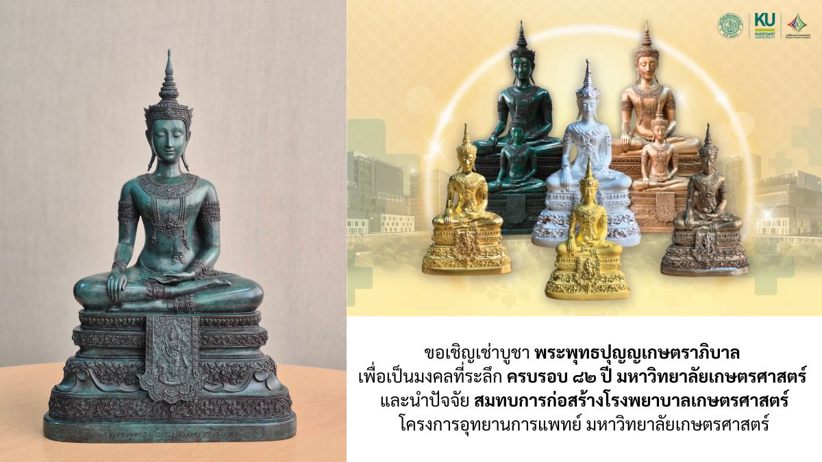 มูลนิธิโรงพยาบาลเกษตรศาสตร์ ขอเชิญเช่าบูชา พระพุทธปุญญเกษตราภิบาล พระประจำโรงพยาบาลเกษตรศาสตร์ ซึ่งเป็นพระพุทธรูปบูชาปางมารวิชัย ในวาระมงคลที่ระลึกครบรอบ 82 ปี ของมหาวิทยาลัยเกษตรศาสตร์ และนำปัจจัยสมทบทุนในการก่อสร้างโรงพยาบาลเกษตรศาสตร์ โครงการอุทยานการแพทย์ มหาวิทยาลัยเกษตรศาสตร์